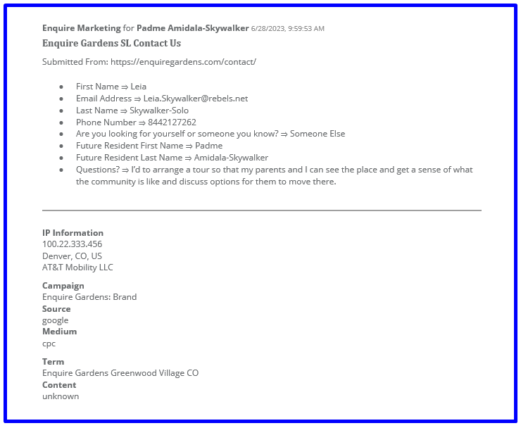 No additional Questions, instead create a generic prospect using inquiring individuals last name: "Prospect Smith", or with relationship "Mom Smith"